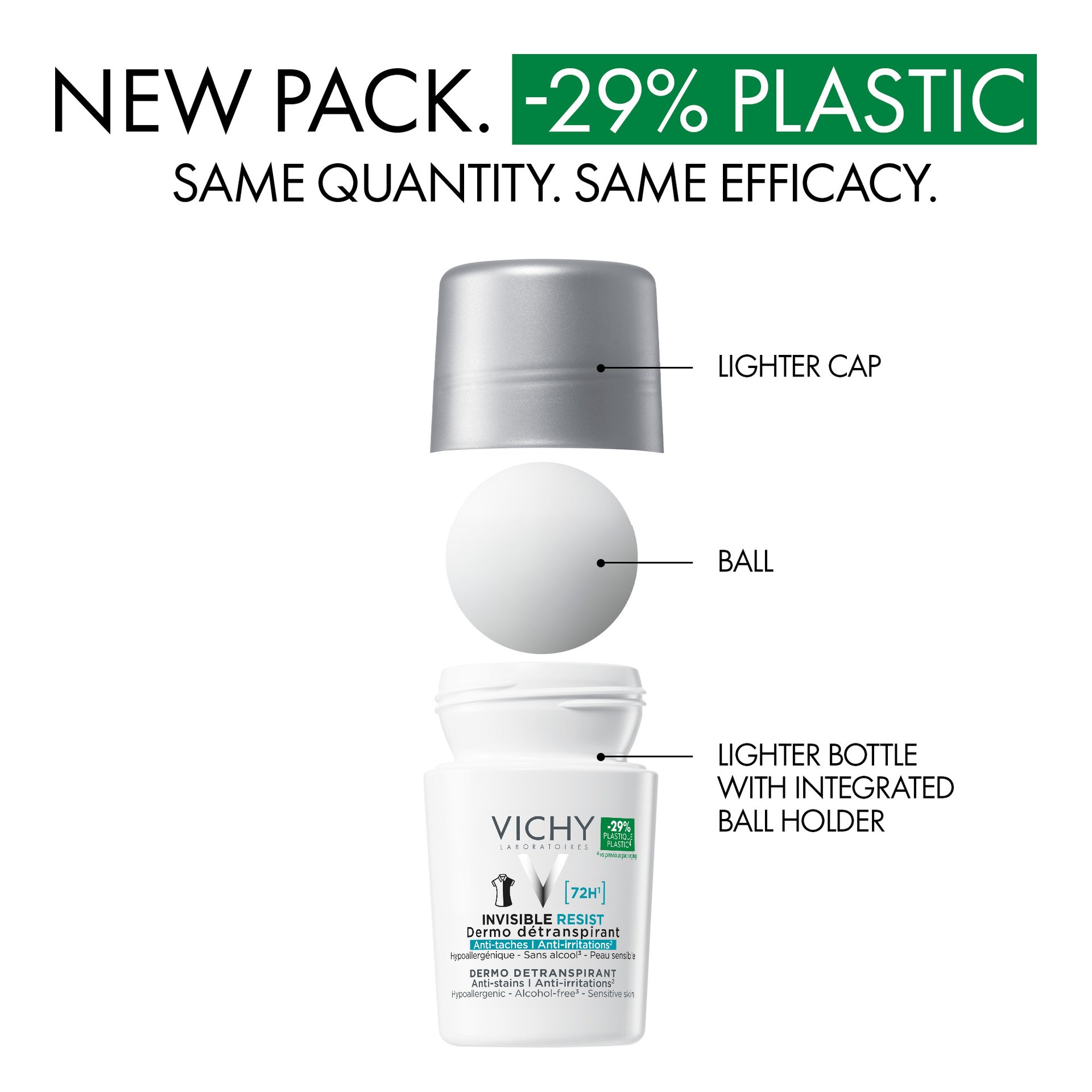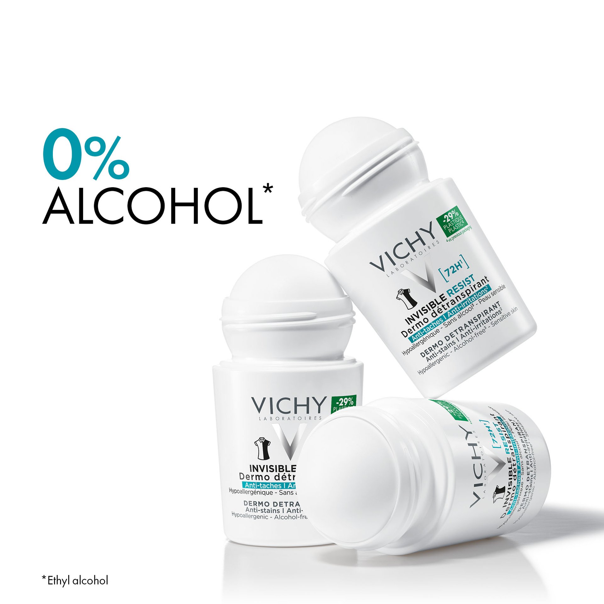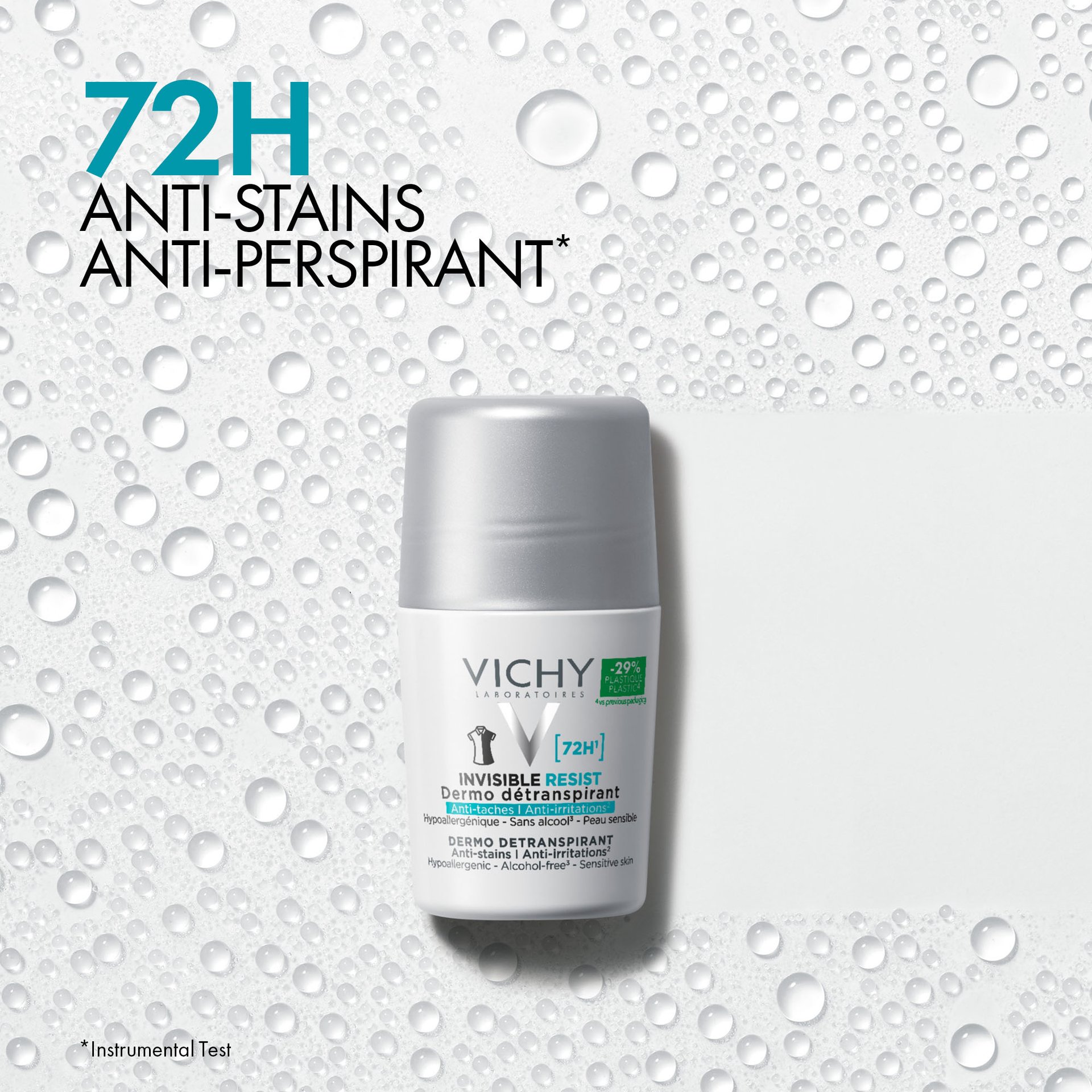 Effektiv 72T antiperspirant deodorant formulert for å unngå gule og hvite merker på klær, samt beskytte hudbarrieren mot irritasjon, tørrhet og rødhet.